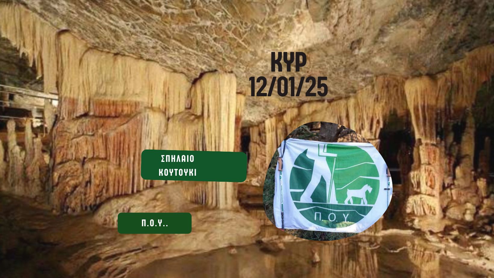 Η πεζοπορία της Κυριακής θα μας πάει στο σπήλαιο Κουτούκι, ένα επισκέψιμο σπήλαιο το οποίο βρίσκεται στις ανατολικές πλαγιές του Υμηττού, πάνω από την Παιανία, σε ύψος 510 μέτρων πάνω από την επιφάνεια της θάλασσας. Το σπήλαιο ανακαλύφθηκε τυχαία το 1926 και χαρτογραφήθηκε το 1954 από τους Ιωάννης και Άννα Πετροχείλου. Η σημερινή τεχνητή είσοδος, μήκους 17 μέτρων, ανοίχθηκε τη δεκαετία του 1960. Οι ποικιλίες σταλακτιτικών σχηματισμών και η υποβλητική ατμόσφαιρα, έδωσαν διάφορα ονόματα στις αίθουσες,