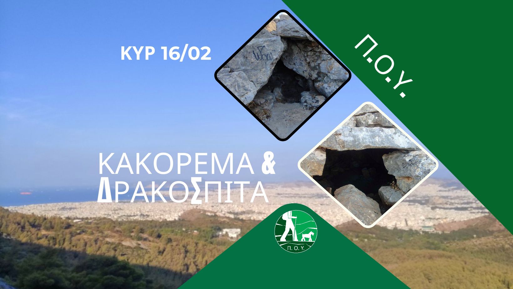 Αυτή την Κυριακή θα κάνουμε μια ενδιαφέρουσα πεζοπορία στον κεντρικό Υμηττό. Θα επισκεφτούμε τα δύο δρακόσπιτα του, αφού απολαύσουμε την θέα στο Κακόρεμα. Κατόπιν θα περπατήσουμε παράλληλα κάτω από τις κεραίες και αφού φτάσουμε στο σημείο που συνήθως κατασκηνώνουν οι πρόσκοποι, στο λεγόμενο τρίστρατο θα πάρουμε το δρόμο της επιστροφής. Για όποιον επιθυμεί μπορεί να